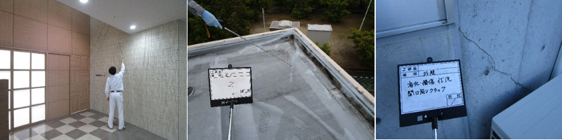 基礎・土台・柱・梁・壁・天井・外壁・屋外設置機器などの欠損・劣化・緊結状況等の現状調査および 塀・工作物等(独立看板等)の設置状況・劣化等の現況の調査